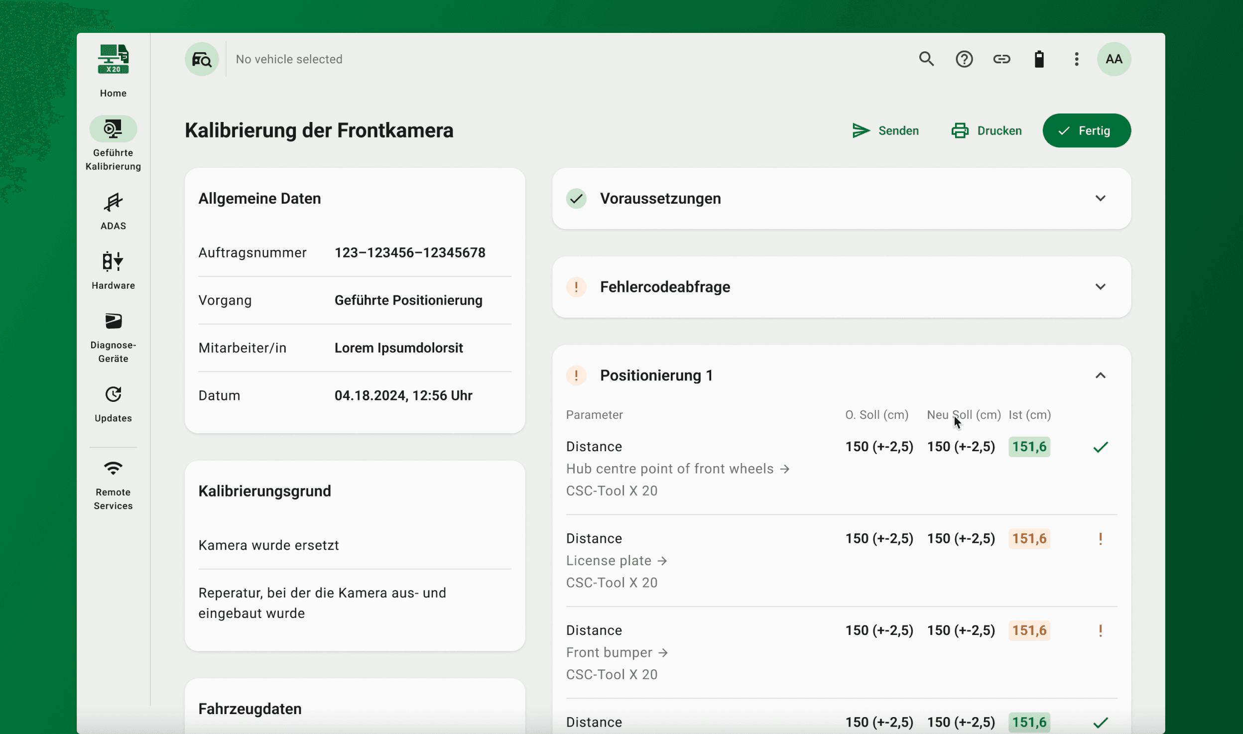 The developed application combines precise handling with modern digital technology. Multiple screens guide the workshop technician through the entire calibration process, both visually and functionally.